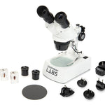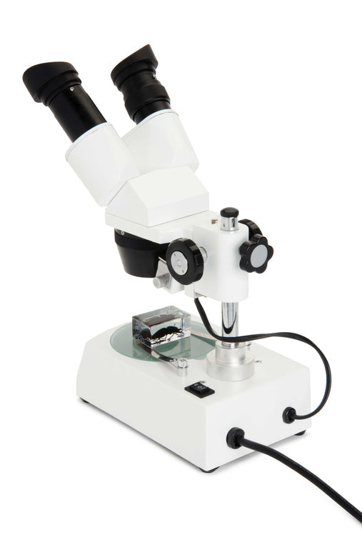 The Celestron Labs S10-60 Stereo Microscope is an all-metal bodied, low-power stereo microscope with advanced features such as high-quality glass optics, 1x and 3x objectives, 10x and 20x eyepieces and upper and lower illuminators.